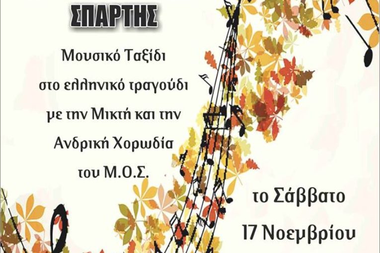 Ο Μουσικός Όμιλος Σπάρτης προσκαλεί τους φίλους του χορωδιακού τραγουδιού σ’ ένα μουσικό ταξίδι στο ελληνικό τραγούδι, που διοργανώνει το Σάββατο 17 Νοεμβρίου, στις 7 μ.μ., στο κέντρο ΑΜΙ στην Μαγούλα.