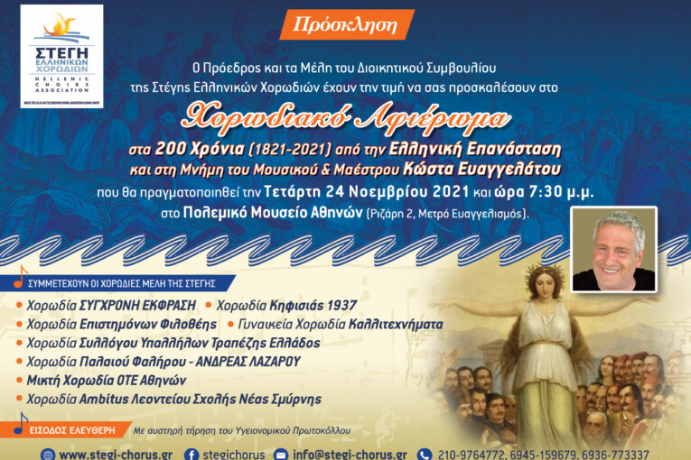 Η Στέγη Ελληνικών Χορωδιών τιμά στις 24 Νοεμβρίου 2021 τους Αγωνιστές της Ελληνικής Επανάστασης του 1821 και την Μνήμη του Μουσικού και Μαέστρου Κώστα Ευαγγελάτου με Χορωδιακό Αφιέρωμα.