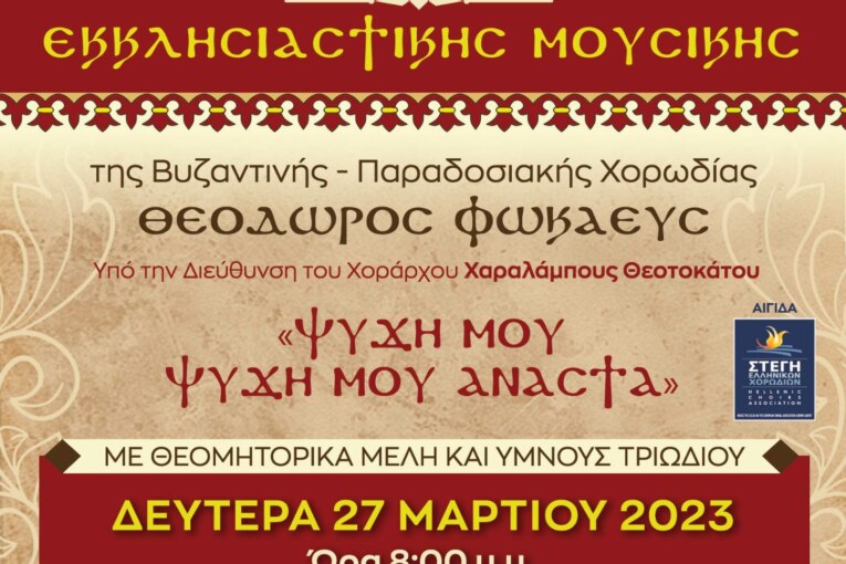 Νέα συναυλία θα πραγματοποιήσει η Βυζαντινή – Παραδοσιακή χορωδία «ΘΕΟΔΩΡΟΣ ΦΩΚΑΕΥΣ», με τίτλο «Ψυχή μου, ψυχή μου Ανάστα», στον Ι. Ν. Αγ. Νικολάου Πατρών, την Δευτέρα 27 Μαρτίου 2023 και ώρα 8.00 μ.μ.