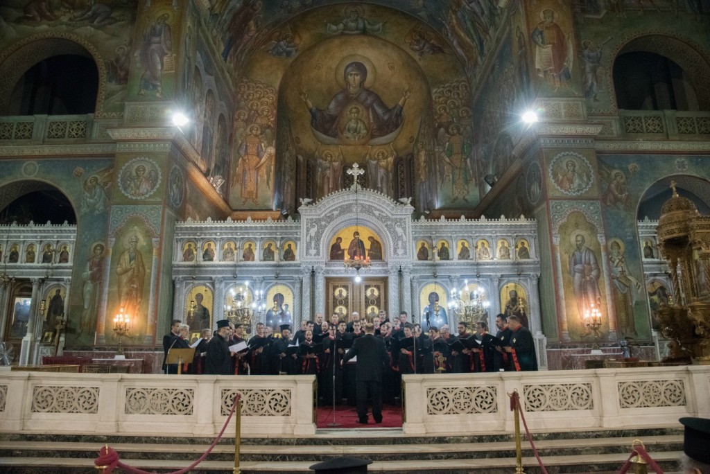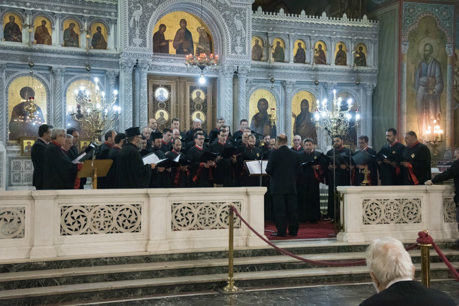 Τον 42μελή Βυζαντινό χορό διευθύνει ο Πρωτοψάλτης του Ι. Ν. Αγ. Σοφίας Πατρών κ. Χαράλαμπος Θεοτοκάτος.