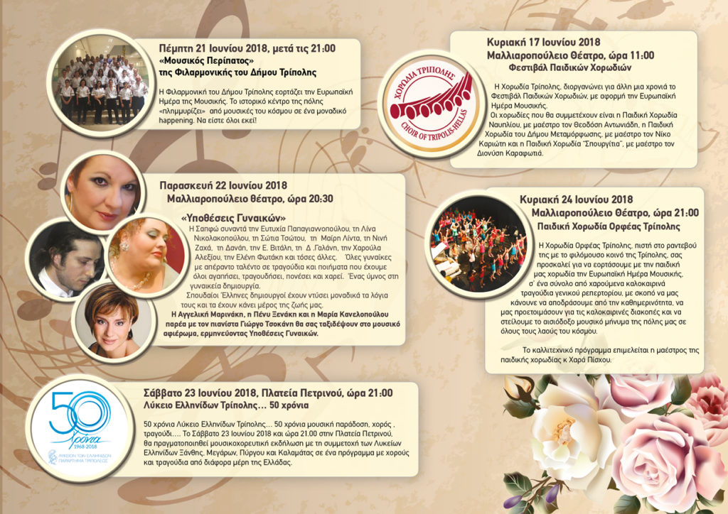 Ευρωπαϊκή Ημέρα Μουσικής – Πρόγραμμα Εκδηλώσεων στην Τρίπολη Posted by Διαχειριστής Ιστοτόπου Στέγης Ελληνικών Χορωδιών Date: 20 Ιουνίου, 2018 in: feature, Νέα Χορωδιών, Χορωδιακές Εκδηλώσεις Leave a comment 2171 Views Αναλυτικές πληροφορίες στις συνημμένες αφίσες.