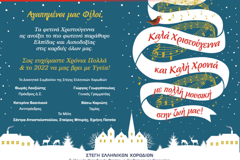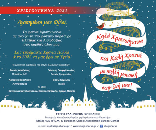 Ευχές Χριστουγέννων 2021 Posted by Διαχειριστής Ιστοτόπου Στέγης Ελληνικών Χορωδιών Date: 20 Δεκεμβρίου, 2021 in: Ανακοινώσεις / Δελτία Τύπου, Νέα Στέγης Leave a comment 1170 Views Με τις Καλύτερες Ευχές μας για Καλά, Ειρηνικά Χριστούγεννα και ένα πιο Αισιόδοξο με Υγεία Νέο Έτος !!!