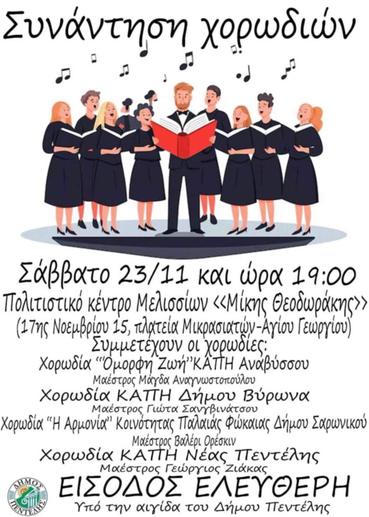 Ο Δήμος Πεντέλης σας προσκαλεί στην εκδήλωση «Συνάντηση χορωδιών», το Σάββατο 23 Νοεμβρίου 2024 και ώρα 19.00, στο Πολιτιστικό Κέντρο Μελισσίων «Μίκης Θεοδωράκης» (17ης Νοεμβρίου 15, πλατεία Μικρασιατών – Αγίου Γεωργίου)