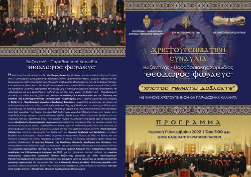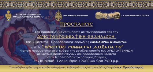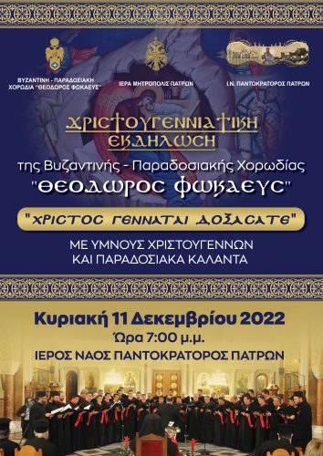 Την πρώτη συναυλία της μετά την 2ετία της πανδημίας του κορωνοϊού, θα πραγματοποιήσει η Βυζαντινή – Παραδοσιακή χορωδία «ΘΕΟΔΩΡΟΣ ΦΩΚΑΕΥΣ» την Κυριακή 11 Δεκεμβρίου και ώρα 7.00 μ.μ. στον Ι. Ν. Παντοκράτορος Πατρών, με τίτλο «Χριστός γεννάται δοξάσατε». Την Χριστουγεννιάτικη συναυλία θα ανοίξει εισαγωγική, επίκαιρη ομιλία του Αιδεσιμολογιωτάτου Πρωτοπρεσβυτέρου του Ι. Ν. Παντοκράτορος Πατρών π. Περικλέους Ρίπιση. Ο Βυζαντινός χορός στη συνέχεια, θα αποδώσει στην εκδήλωση επίκαιρους και διαχρονικούς Βυζαντινούς ύμνους, με αφορμή την μεγάλη εορτή των Χριστουγέννων, στο πρώτο μέρος της, υπό την διεύθυνση του χοράρχη του, Μουσικολογιωτάτου Πρωτοψάλτου του Ι. Ν. Αγ. Σοφίας Πατρών, κ. Χαραλάμπους Θεοτοκάτου. Στο δεύτερο μέρος της μουσικής εσπερίδας, η Βυζαντινή – Παραδοσιακή χορωδία θα παρουσιάσει παραδοσιακά Κάλαντα από διάφορα μέρη της πατρίδας μας. Η παρουσίαση των ύμνων και καλάντων που θα αποδώσει η χορωδία, θα γίνει από τον πρόεδρό της κ. Γεώργιο Βέργο. Την εκδήλωση θα τιμήσει με την παρουσία του και θα ευλογήσει ο Σεβασμιώτατος Μητροπολίτης Πατρών κ.κ. Χρυσόστομος.