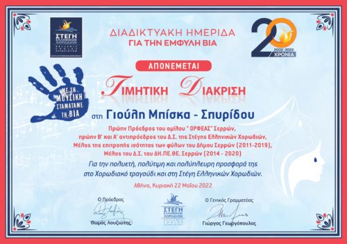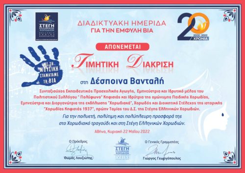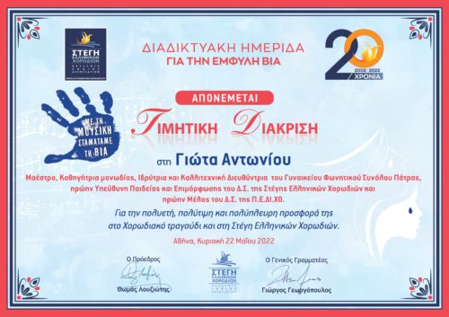 Με μεγάλη επιτυχία ολοκληρώθηκε η Διαδικτυακή Ημερίδα της Στέγης Ελληνικών Χορωδιών σχετικά με την καταπολέμηση της έμφυλης βίας με τίτλο “Με τη μουσική σταματάμε τη βία”, που πραγματοποιήθηκε την Κυριακή 22 Μαρτίου 2022 στο πλαίσιο του εορτασμού των
