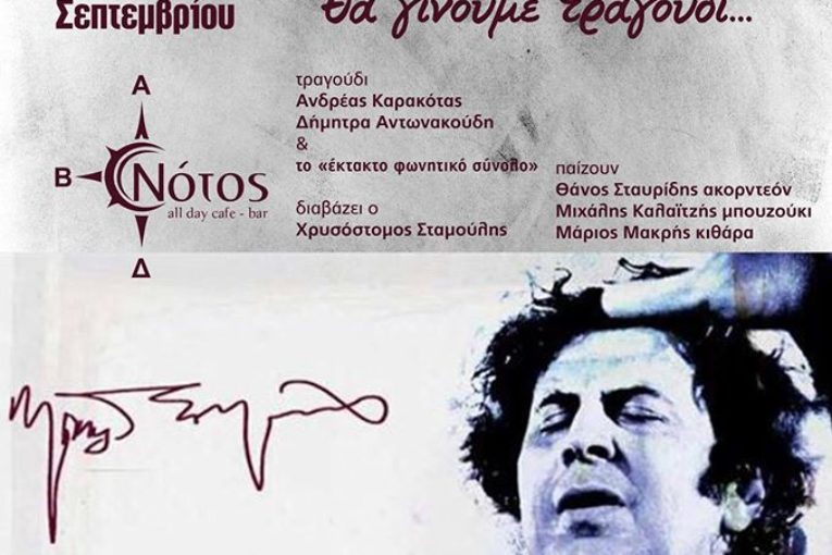 Μία ιδιαίτερη μουσική βραδιά – αφιέρωμα στο μεγάλο δημιουργό Μίκη Θεοδωράκη στο Notos All Day Bar το Σάββατο 2 Σεπτεμβρίου 2017.