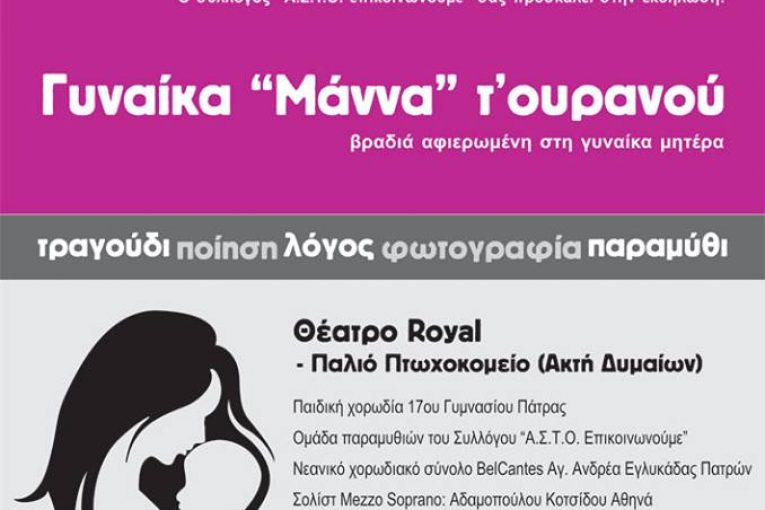 Γυναίκα “Μάννα” τ’ ουρανού (Πάτρα) Posted by Διαχειριστής Ιστοτόπου Στέγης Ελληνικών Χορωδιών Date: 04 Μαΐου, 2017 in: Ειδήσεις Leave a comment 2239 Views Βραδιά αφιερωμένη στη γυναίκα μητέρα Πάτρα, 13 Μαΐου 2017