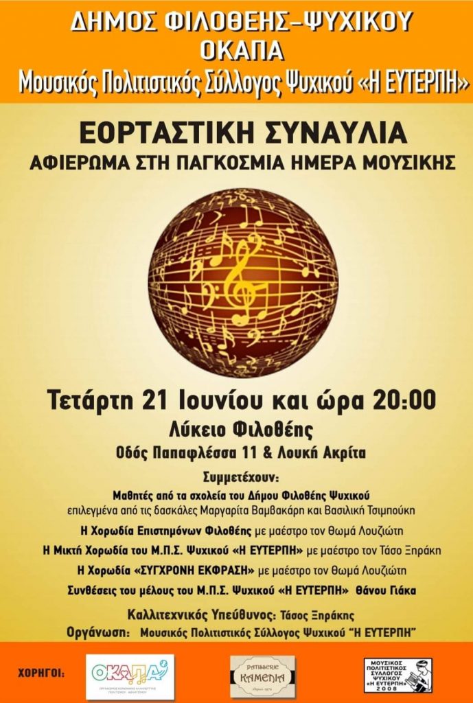 Εορταστική Συναυλία στη Φιλοθέη για την Παγκόσμια Ημέρα Μουσικής Posted by Πολιτιστικό Σωματείο Σύγχρονη Έκφραση - Χορωδία «Σύγχρονη Έκφραση» Date: 21 Ιουνίου, 2023 in: feature, Δελτία Τύπου Μελών, Κάλεσμα, Νέα Χορωδιών Leave a comment 464 Views Αναλυτικές πληροφορίες στην πρόσκληση και την αφίσα.