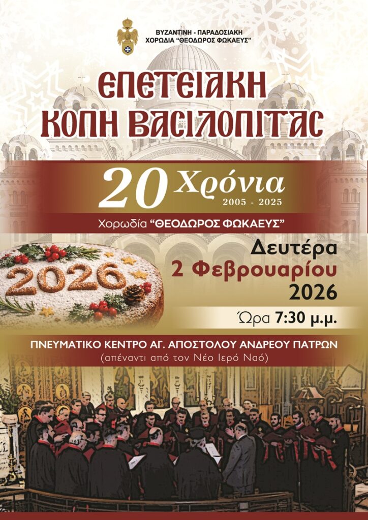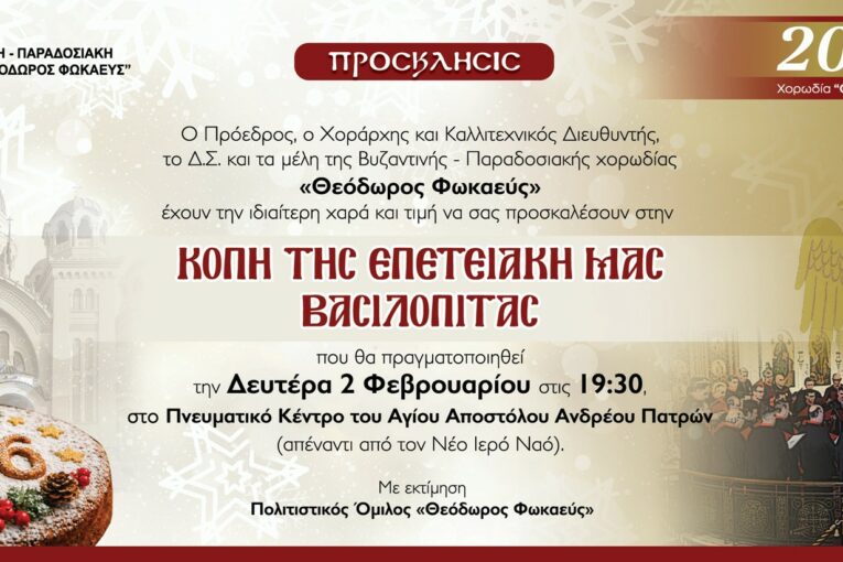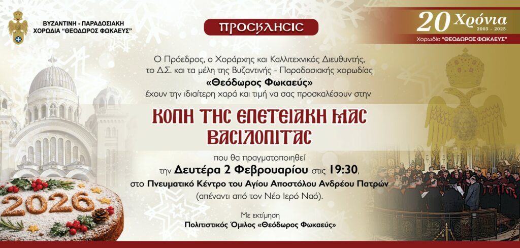 Η Βυζαντινή – Παραδοσιακή χορωδία «Θεόδωρος Φωκαεύς», επί τη συμπληρώσει 20 ετών μουσικής ύπαρξης, ιστορίας και πολιτιστικής πορείας, θα κόψει την επετειακή Βασιλόπιτα 20ετίας της, την ερχόμενη Δευτέρα 2 Φεβρουαρίου 2026,  στις 7.30 μ.μ., στο Πνευματικό Κέντρο του Αγ. Αποστόλου Ανδρέου Πατρών, απέναντι από τον νέο Ιερό Ναό του Πολιούχου μας. Την κοπή της βασιλόπιτας θα ευλογήσει ο Σεβασμιώτατος Μητροπολίτης Πατρών κ.κ. Χρυσόστομος, ενώ ο χοράρχης της χορωδίας και τα μέλη της θα ψάλλουν την ακολουθία της.