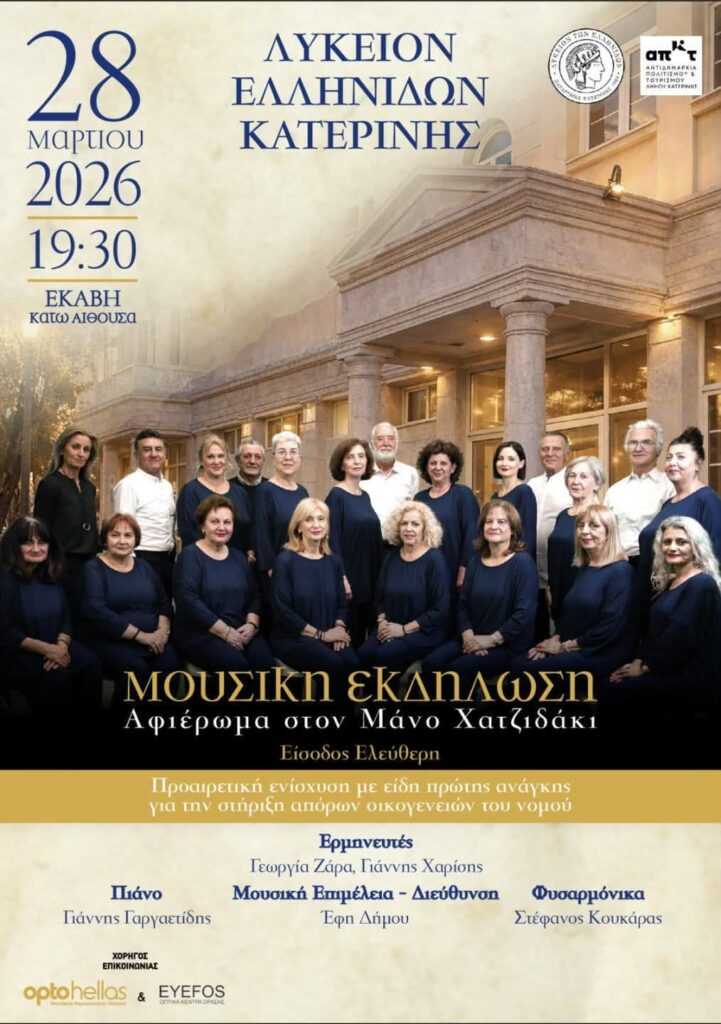 Λύκειον Ελληνίδων Κατερίνης – Μουσική εκδήλωση αφιέρωμα στον Μάνο Χατζιδάκι Posted by Διαχειριστής Ιστοτόπου Στέγης Ελληνικών Χορωδιών Date: 27 Μαρτίου, 2026 in: Ειδήσεις, Πολιτιστικές - Μουσικές Ειδήσεις, Χορωδιακές Εκδηλώσεις Leave a comment 7 Views