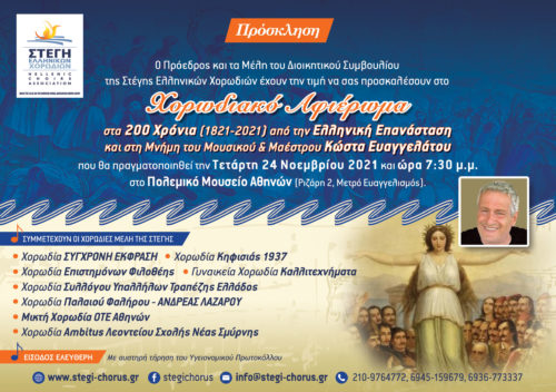 Η Στέγη Ελληνικών Χορωδιών τιμά στις 24 Νοεμβρίου 2021 τους Αγωνιστές της Ελληνικής Επανάστασης του 1821 και την Μνήμη του Μουσικού και Μαέστρου Κώστα Ευαγγελάτου με Χορωδιακό Αφιέρωμα.