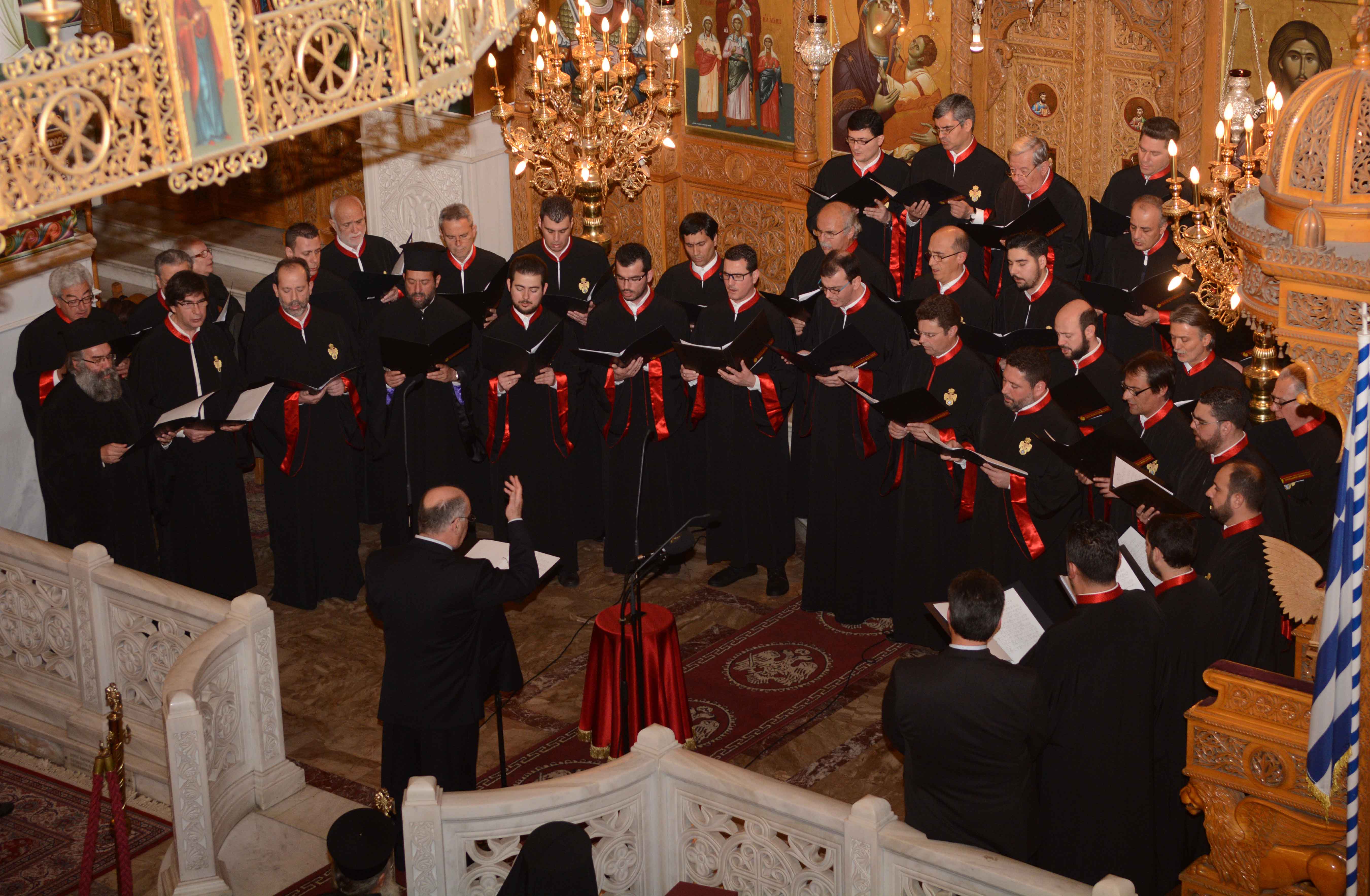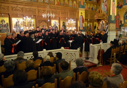 Την συναυλία άνοιξε με ομιλία του ο πρόεδρος της χορωδίας κ. Γεώργιος Βέργος, ο οποίος πέραν της μουσικής πορείας του χορού στην 11ετή ιστορία του, αναφέρθηκε με θερμά λόγια στους στενούς δεσμούς του χοράρχη και του ιδίου με την ενορία της Αγίας Σοφίας. Κατόπιν, ο Βυζαντινός χορός, στο πρώτο μέρος της εκδήλωσης, απέδωσε με μοναδικό τρόπο ύμνους Τριωδίου και Θεομητορικά μέλη, υπό την διεύθυνση του χοράρχη του, Πρωτοψάλτη του ανωτέρω ιερού ναού, κ. Χαραλάμπους Θεοτοκάτου. Ξεχώρισε η κατανυκτική εκτέλεση του πασίγνωστου ύμνου «Τη Υπερμάχω», όπου όλοι οι παρευρισκόμενοι σηκώθηκαν όρθιοι και έψαλλαν μαζί με τη χορωδία και οι ανεπανάληπτες, κορυφαίες, συγκινητικές, μονωδιακές αποδόσεις των ύμνων «Παναγία Παρθένε» και «Ψυχή μου Ψυχή μου» από τους χορωδούς Γεώργιο Λαμπρόπουλο και Κωνσταντίνο Αγγελακόπουλο αντίστοιχα. Την ανάλυση και παρουσίαση των ύμνων σε όλη την εκδήλωση, έκανε ο πρόεδρος της χορωδίας κ. Γεώργιος Βέργος.