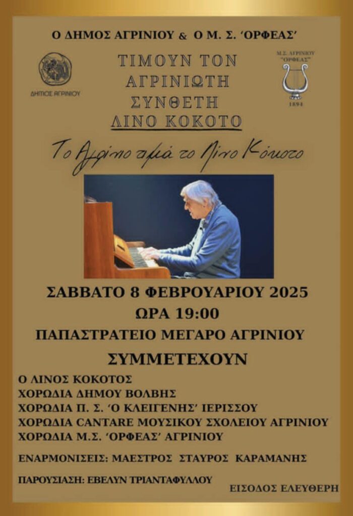 Το Αγρίνιο τιμά τον Λίνο Κόκοτο Posted by Διαχειριστής Ιστοτόπου Στέγης Ελληνικών Χορωδιών Date: 10 Φεβρουαρίου, 2025 in: Δελτία Τύπου Μελών, Νέα Χορωδιών, Χορωδιακές Εκδηλώσεις Leave a comment 54 Views
