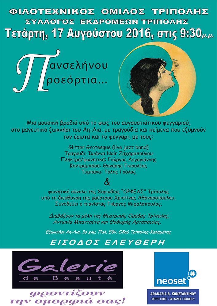Ο Φιλοτεχνικός Όμιλος Τρίπολης, σε συνεργασία με την Χορωδία «ΟΡΦΕΑΣ» Τρίπολης, την Θεατρική Ομάδα Τρίπολης και τον Σύλλογο Εκδρομέων Τρίπολης, διοργανώνουν μουσική εκδήλωση με τίτλο «Πανσελήνου Προεόρτια». Μια μέρα πριν την Αυγουστιάτικη Πανσέληνο, μια καλοκαιρινή βραδιά υπό το φως του φεγγαριού, στο μαγευτικό άλσος του Προφήτη Ηλία, με τραγούδια και κείμενα που εξυμνούν τον έρωτα και το φεγγάρι.