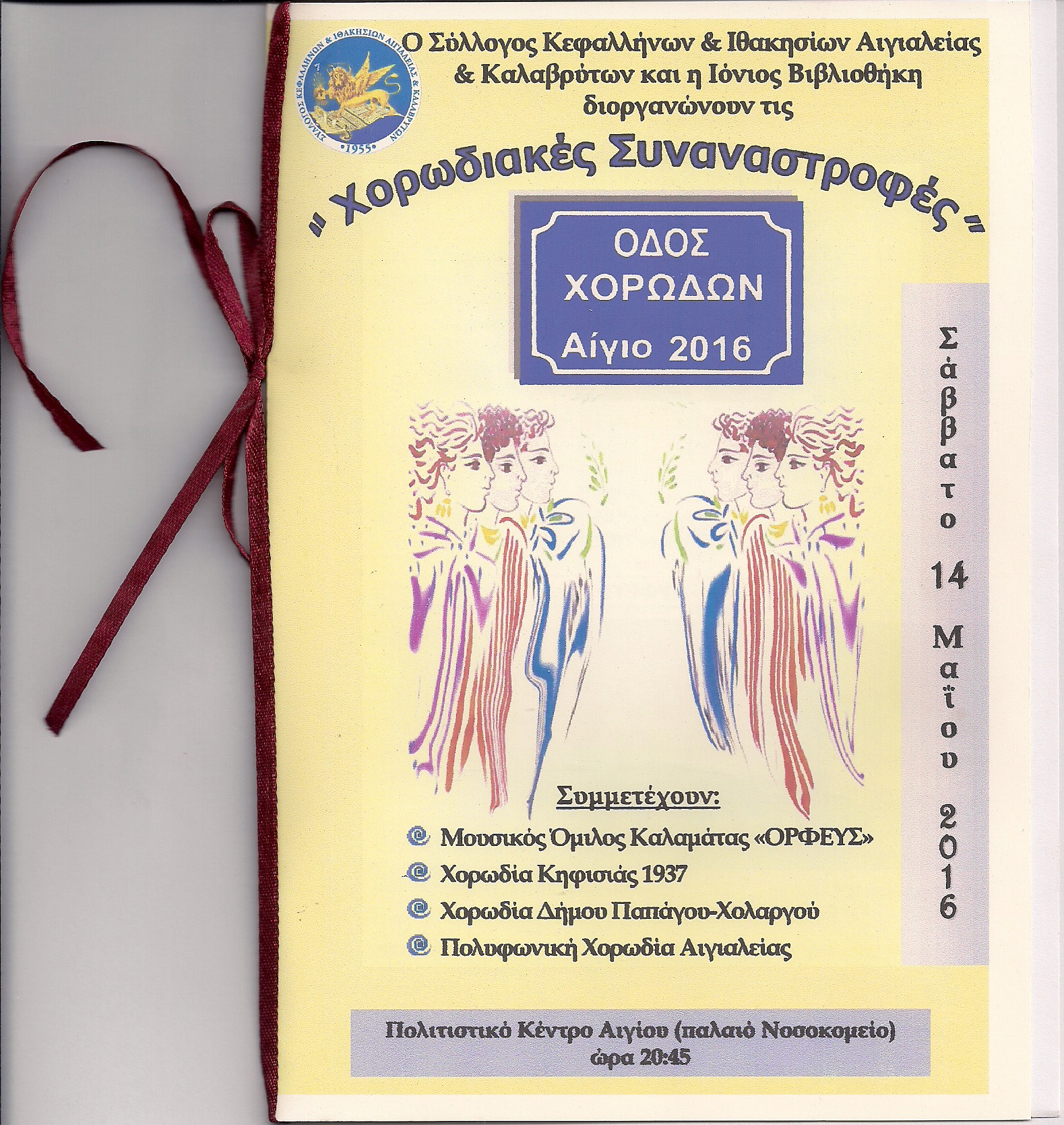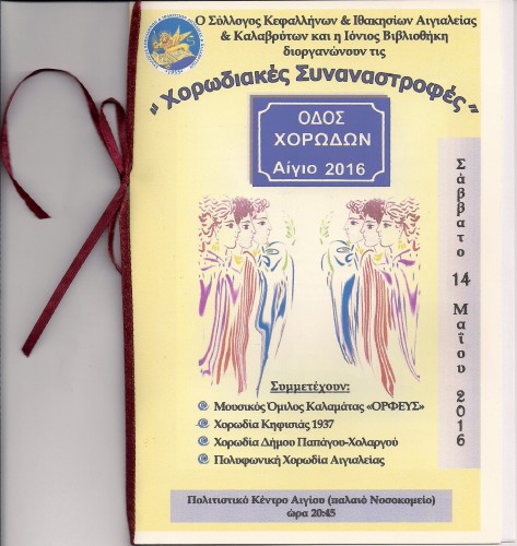 Το βράδυ του Σαββάτου 14 Μαΐου έκλεισε με τον πιο όμορφο τρόπο η αυλαία της χορωδιακής συνάντησης , Χορωδιακές Συναναστροφές «Οδός Χορωδών», Αίγιο 2016, που διοργανώθηκε από το Σύλλογο Κεφαλλήνων & Ιθακησίων και την Ιόνιο Βιβλιοθήκη Αιγίου στο Πολιτιστικό Κέντρο Αιγίου.