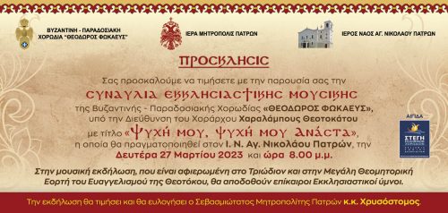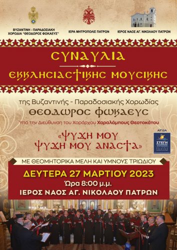 Νέα συναυλία θα πραγματοποιήσει η Βυζαντινή – Παραδοσιακή χορωδία «ΘΕΟΔΩΡΟΣ ΦΩΚΑΕΥΣ», με τίτλο «Ψυχή μου, ψυχή μου Ανάστα», στον Ι. Ν. Αγ. Νικολάου Πατρών, την Δευτέρα 27 Μαρτίου 2023 και ώρα 8.00 μ.μ.