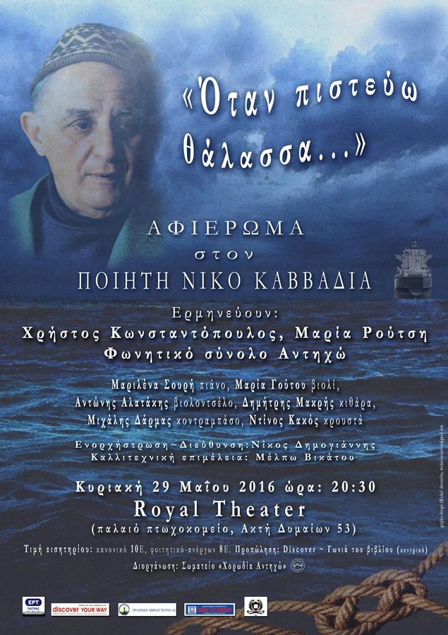 Όταν πιστεύω θάλασσα Posted by Διαχειριστής Ιστοτόπου Στέγης Ελληνικών Χορωδιών Date: 27 Μαΐου, 2016 in: Χορωδιακές Εκδηλώσεις Leave a comment 2589 Views Αφιέρωμα στο ποιητή Νίκο Καββαδία