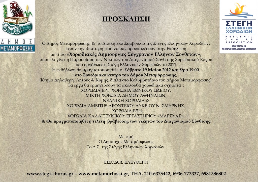 >> ΑΝΑΚΟΙΝΩΣΗ ΑΝΑΒΟΛΗΣ ΕΚΔΗΛΩΣΗΣ – ΠΑΡΟΥΣΙΑΣΗΣ ΕΡΓΩΝ ΔΙΑΓΩΝΙΣΜΟΥ ΣΥΝΘΕΣΗΣ ΧΟΡΩΔΙΑΚΟΥ ΕΡΓΟΥ