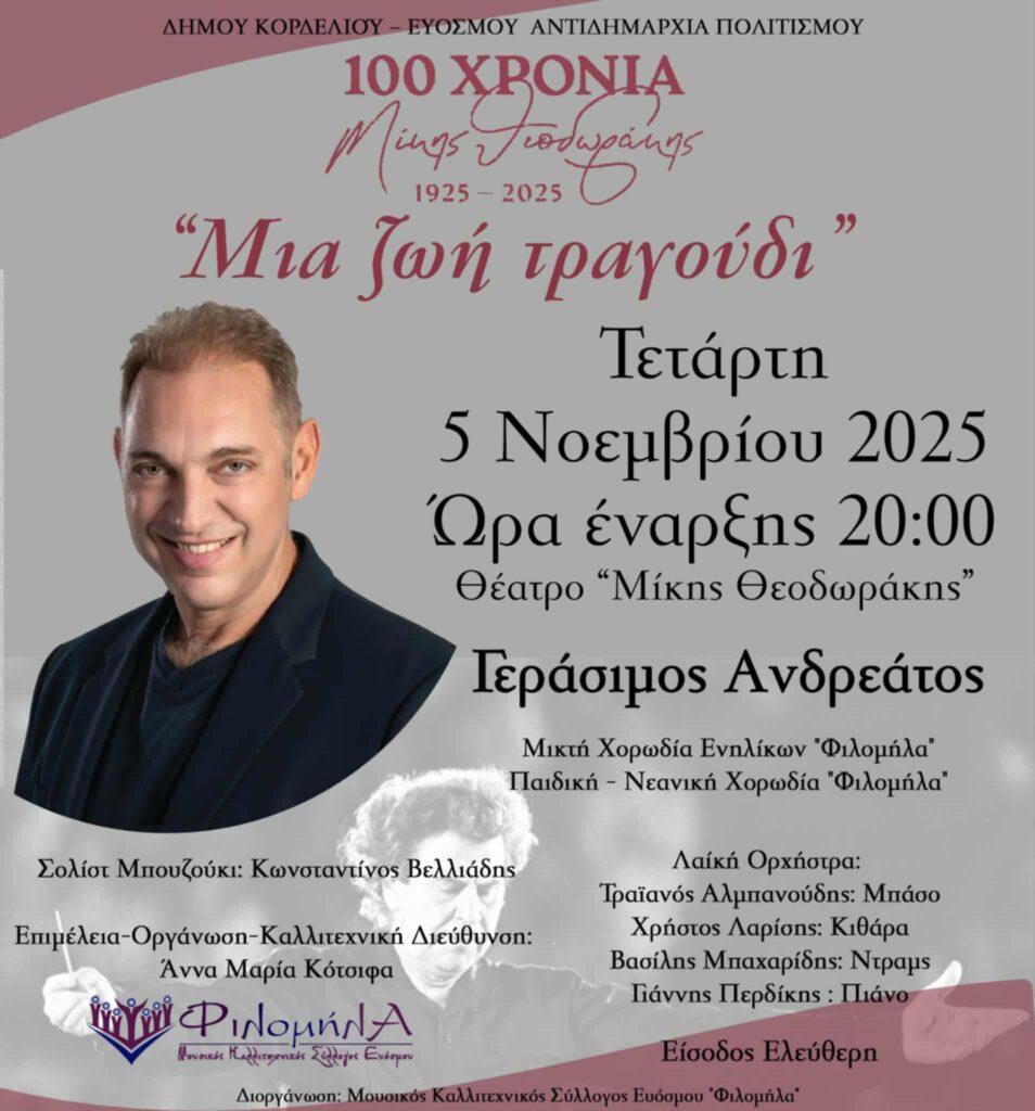 100 Χρόνια Μίκης Θεοδωράκης – Μια Ζωή Τραγούδι Posted by Διαχειριστής Ιστοτόπου Στέγης Ελληνικών Χορωδιών Date: 03 Νοεμβρίου, 2025 in: Ειδήσεις, Νέα Χορωδιών, Χορωδιακές Εκδηλώσεις Leave a comment 13 Views