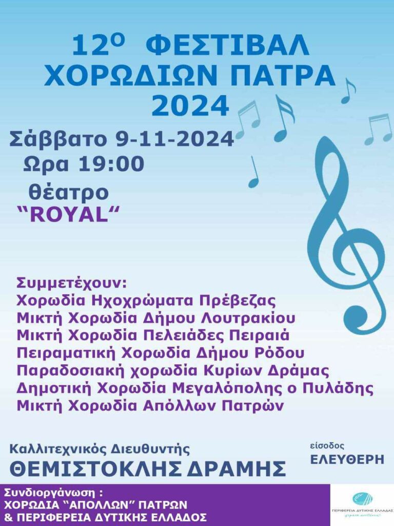 Η Μικτή Ευρωπαϊκή Χορωδία «Απόλλων» Πατρών, διοργανώνει στις 9 Νοεμβρίου 2024 την πολιτιστική εκδήλωση με τίτλο «12ο Φεστιβάλ Χορωδιών – Πάτρα 2024». Πρόκειται για μια μουσική εκδήλωση που διοργανώνεται για 12 χρόνια με μεγάλη επιτυχία. Συμμετέχουν οι χορωδίες: «Παραδοσιακή χορωδία Ένωσης Κυριών Δράμας», «Πειραματική Χορωδία Δήμου Ρόδου», «Χορωδία Ηχοχρώματα Πρέβεζας», «Μικτή Χορωδία Πελειάδες Πειραιά», «Δημοτική Χορωδία Μεγαλόπολης ο Πυλάδης», «Μικτή Χορωδία Δήμου Λουτρακίου» και «Μικτή Χορωδία Απόλλων Πατρών». Θα ακουστούν τραγούδια γνωστών στιχουργών και μεγάλων ποιητών και μουσικές από την Ελλάδα και το εξωτερικό.
