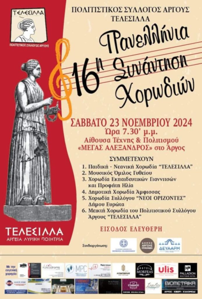 Ο Πολιτιστικός Σύλλογος Άργους «ΤΕΛΕΣΙΛΛΑ» διοργανώνει την 16ηΠανελλήνια Χορωδιακή Συνάντηση το Σάββατο 23 Νοεμβρίου 2024 στην Αίθουσα Τέχνης & Πολιτισμού «Μέγας Αλέξανδρος».