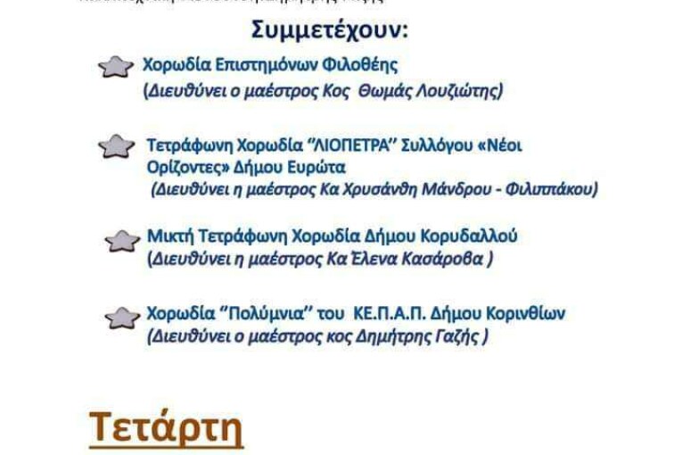 26η Χορωδιακή Συνάντηση Χορωδίας ”Πολύμνια” ΚΕΠΑΠ Δήμου Κορινθίων Posted by Διαχειριστής Ιστοτόπου Στέγης Ελληνικών Χορωδιών Date: 07 Δεκεμβρίου, 2023 in: feature, Κάλεσμα, Νέα Χορωδιών, Χορωδιακές Εκδηλώσεις Leave a comment 66 Views Τετάρτη 13 Δεκεμβρίου 2023 , ώρα 7:00 το απόγευμα, στο δημοτικό Θέατρο ”Θωμάς Θωμαίδης” στην Κόρινθο (πανεπιστήμιο)