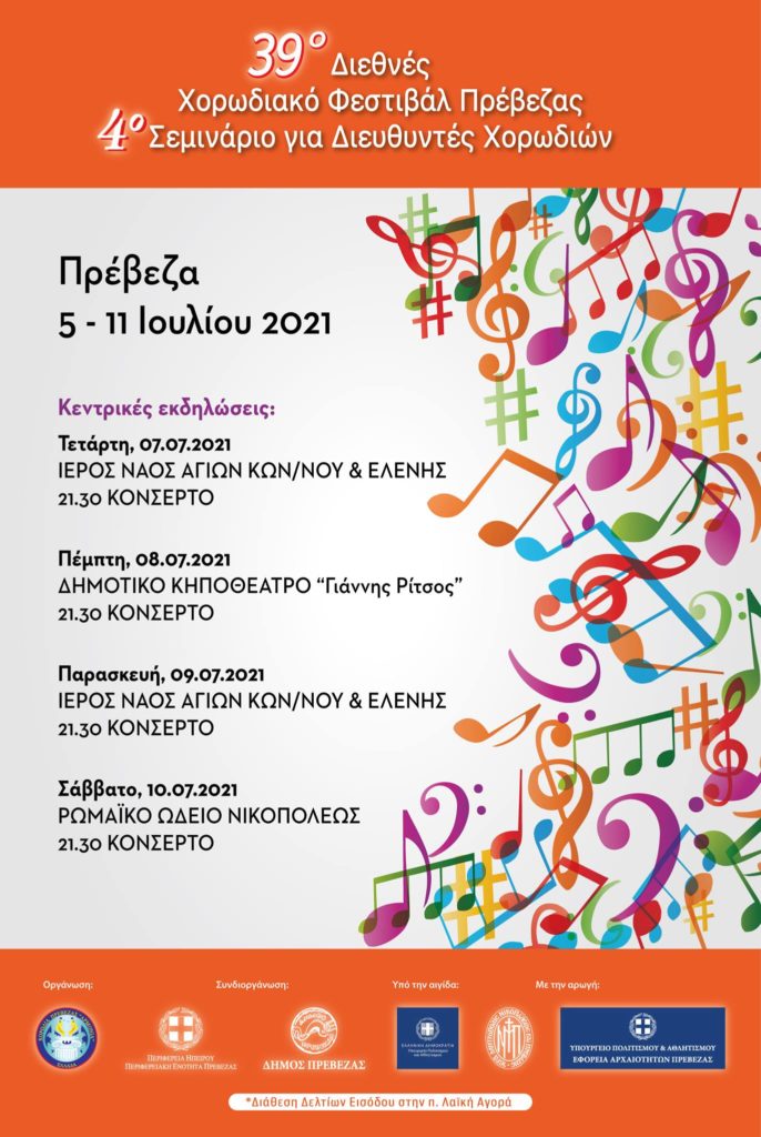 Σε εξέλιξη βρίσκεται το 39ο Διεθνές Χορωδιακό Φεστιβάλ Πρέβεζας & το 4ο Σεμινάριο για Διευθυντές Χορωδιών, που ξεκίνησαν στις 5 Ιουλίου.