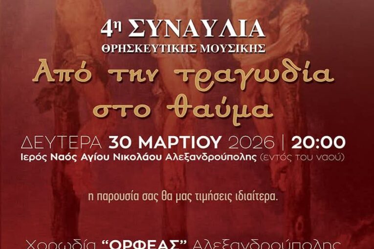 4η Συναυλία Θρησκευτική Μουσικής – Από την τραγωδία στο Θαύμα Posted by Διαχειριστής Ιστοτόπου Στέγης Ελληνικών Χορωδιών Date: 27 Μαρτίου, 2026 in: Ειδήσεις, Πολιτιστικές - Μουσικές Ειδήσεις, Χορωδιακές Εκδηλώσεις Leave a comment 7 Views