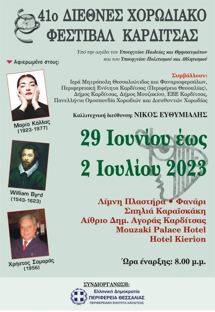 Από Πέμπτη 29 Ιουνίου- Κυριακή 2 Ιουλίου 2023 θα πραγματοποιηθεί το 41ο Διεθνές Χορωδιακό Φεστιβάλ Καρδίτσας υπό την αιγίδα του Υπουργείου Πολιτισμού και Αθλητισμού, κορυφαίος θεσμός του Νομού Καρδίτσας, πρότυπο επαρχιακού Διεθνούς Φεστιβάλ, ένας ιστορικός χορωδιακός θεσμός της Ελλάδος και διεθνώς. Το συγκεκριμένο Χορωδιακό Φεστιβάλ, στο οποίο έχουν λάβει μέρος κορυφαίες χορωδίες από κάθε γωνιά της γης, διακεκριμένες ορχήστρες και σπουδαίοι σολίστ, οργανώνεται από το 1983 στην Καρδίτσα και αποτελεί κορυφαίο καλλιτεχνικό γεγονός, ενώ υλοποιείται υπό την καλλιτεχνική διεύθυνση του Μαέστρου και Καθηγητή Νίκου Ευθυμιάδη. Πάνω από 150 χορωδίες από την Ελλάδα και το Εξωτερικό, συμφωνικές ορχήστρες, σολίστ, μαέστροι, συνθέτες συμμετέχουν κάθε χρόνο στο Διεθνές Φεστιβάλ Καρδίτσας!