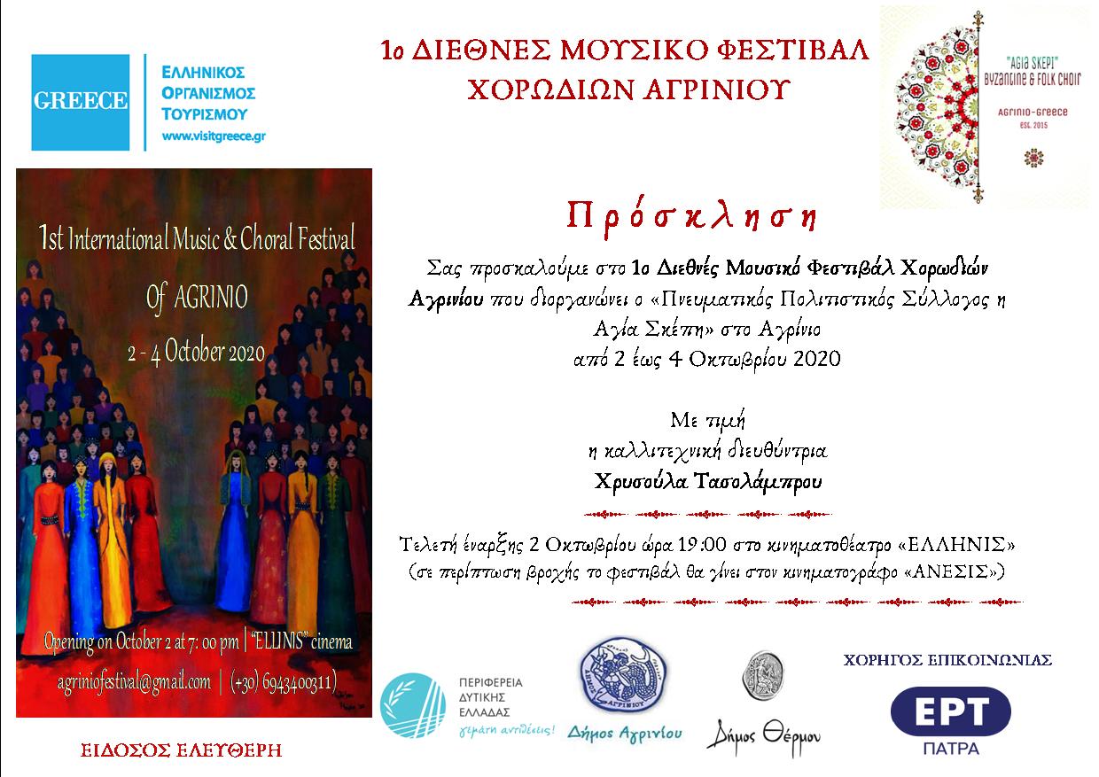 Ο «Πνευματικός Πολιτιστικός Σύλλογος Αγία Σκέπη» με κύρια δραστηριότητα τη χορωδία «Αγία Σκέπη», επίσημος εγγεγραμμένος φορέας του Υπουργείου Πολιτισμού (αρ.μητρ. 6113) ανακοινώνει το «1ο Διεθνές Φεστιβάλ Χορωδιών Αγρινίου 2020» – 1st International Choral Festival of Agrinio 2020» που θα διεξαχθεί στο Αγρίνιο στις 2, 3 και 4 Οκτωβρίου 2020.