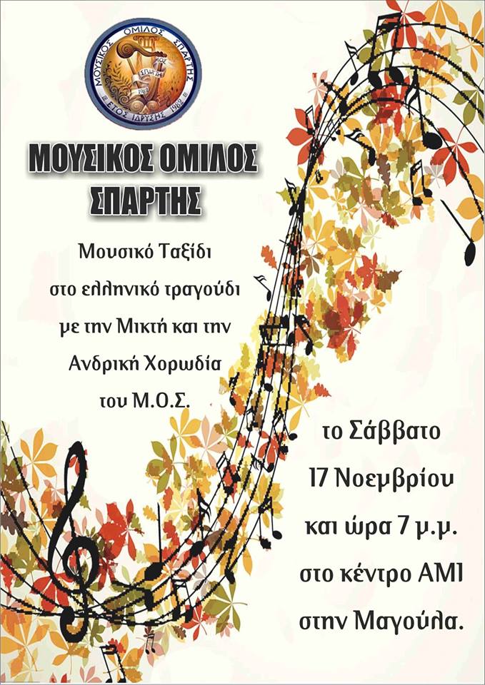 Ο Μουσικός Όμιλος Σπάρτης προσκαλεί τους φίλους του χορωδιακού τραγουδιού σ’ ένα μουσικό ταξίδι στο ελληνικό τραγούδι, που διοργανώνει το Σάββατο 17 Νοεμβρίου, στις 7 μ.μ., στο κέντρο ΑΜΙ στην Μαγούλα.