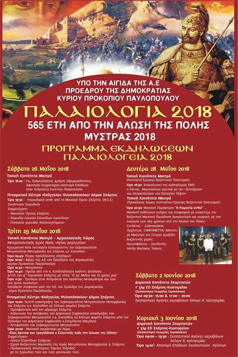 Σειρά εκδηλώσεων με τίτλο «Παλαιολόγια 2018» διοργανώνεται υπό την αιγίδα της Προεδρίας της Δημοκρατίας, για τη συμπλήρωση 565 χρόνων από την Άλωση της Κωνσταντινούπολης. Δείτε το πλήρες πρόγραμμα στην συνημμένη αφίσα.