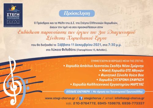 Παρουσίαση των 12 καλύτερων έργων του 3ου Διαγωνισμού Σύνθεση Χορωδιακού Έργου το Σάββατο 11 Δεκεμβρίου 2021 στο Λύκειο Φιλοθέης (Παπαφλέσσα 15, Φιλοθέη).