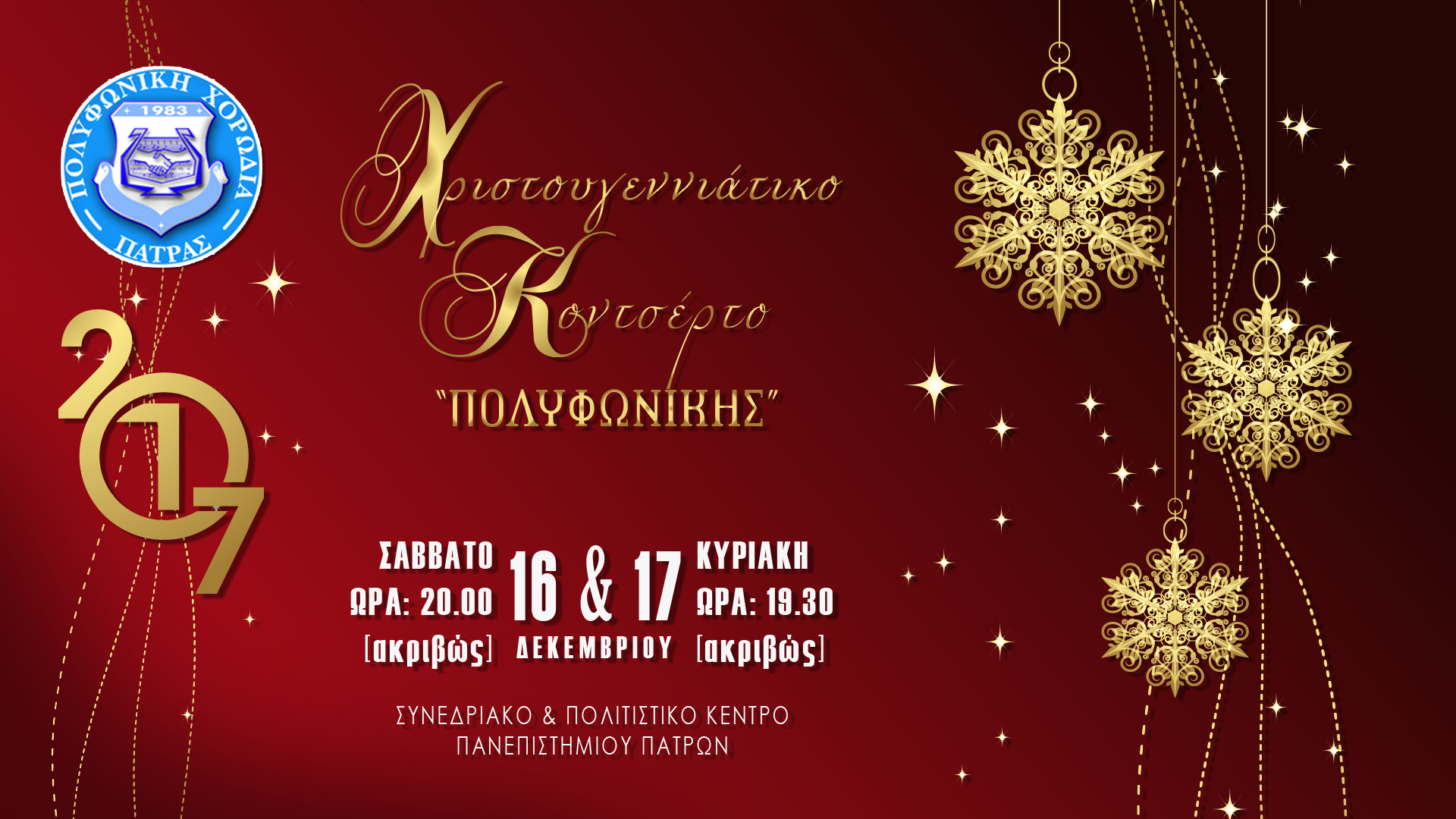 Στην τελική ευθεία βρίσκονται οι προετοιμασίες για το μεγάλο εορταστικό θεσμό του ΧΡΙΣΤΟΥΓΕΝΝΙΑΤΙΚΟΥ ΚΟΝΤΣΕΡΤΟΥ της ‘’ΠΟΛΥΦΩΝΙΚΗΣ’’, που φέτος θα πραγματοποιηθεί 16 και 17 Δεκεμβρίου, στο Συνεδριακό και Πολιτιστικό Κέντρο του Πανεπιστημίου Πατρών, στις 8 και στις 7.30 το βράδυ αντιστοίχως.