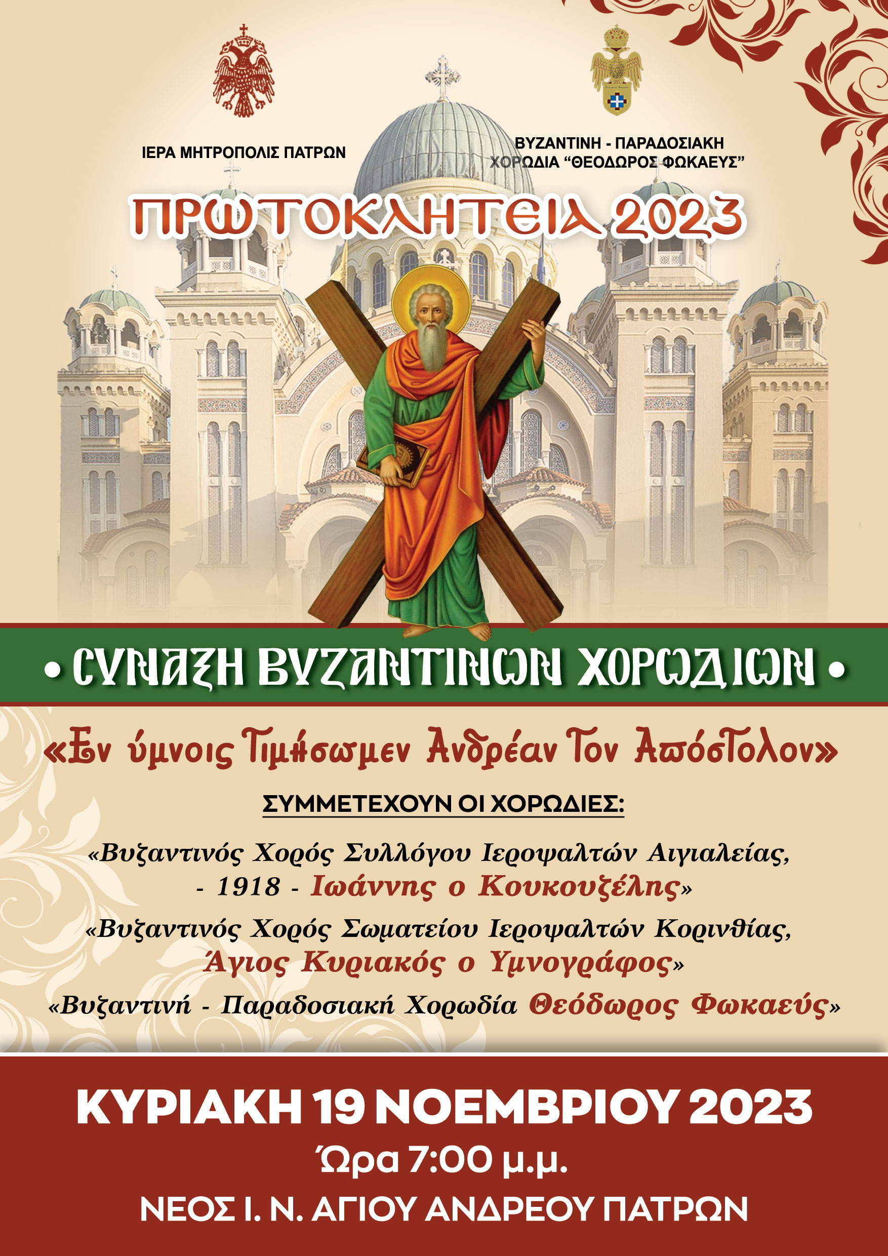 Στα πλαίσια των Πρωτοκλητείων 2023, θα πραγματοποιηθεί μουσική σύναξη τριών Βυζαντινών χορωδιών, την επόμενη Κυριακή 19 Νοεμβρίου 2023, στον νέο Ι. Ν. Αγ. Ανδρέου Πατρών, στις 7.00 μ.μ., με τίτλο «Εν ύμνοις τιμήσωμεν Ανδρέαν τον Απόστολον». Η συναυλία η οποία είναι αφιερωμένη στον Πρωτόκλητο μαθητή και Πολιούχο της πόλης μας Απόστολο Ανδρέα, περιλαμβάνει επίκαιρους ύμνους και γνωστά μέλη όλου του ενιαυτού, πραγματοποιείται δε με πρωτοβουλία του προέδρου της Βυζαντινής – Παραδοσιακής χορωδίας ¨Θεόδωρος Φωκαεύς» κ. Γεωργίου Βέργου, στα πλαίσια της συνεργασίας και της σύσφιξης των μουσικών σχέσεων των τριών Βυζαντινών σχημάτων. Πρόκειται για την συνέχεια της Χριστουγεννιάτικης εκδήλωσης με τίτλο «Γενεθλίων Προηχήσεις», που οι τρεις χορωδίες πραγματοποίησαν στον Μητροπολιτικό Ι. Ν. Φανερωμένης Αιγίου, τον περασμένο Δεκέμβριο.