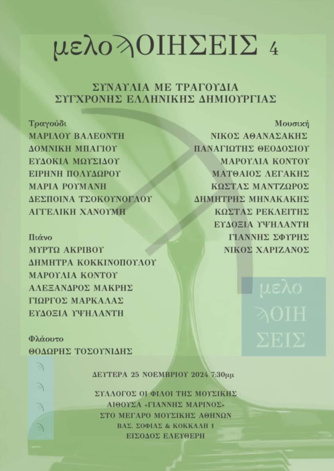 Για τέταρτη συνεχή χρονιά συναυλία με τραγούδια σύγχρονης ελληνικής δημιουργίας.