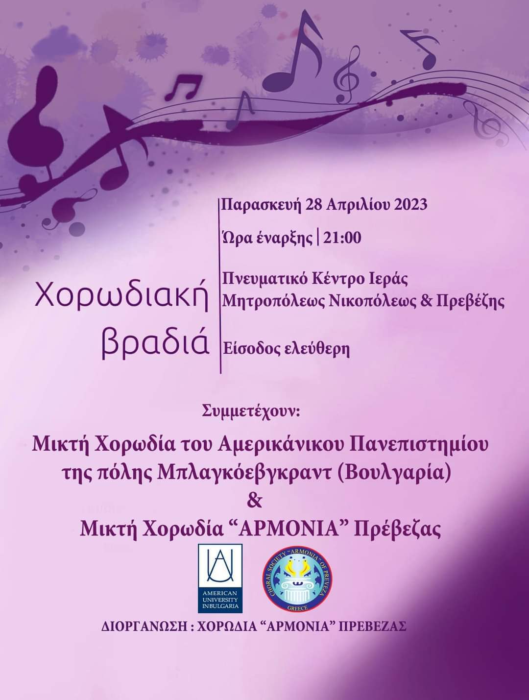 Χορωδιακή βραδιά διοργανώνει η Χορωδία Πρέβεζας “Αρμονία” την Παρασκευή 28 Απριλίου στις 21.00 στο Πνευματικό Κέντρο της Ι. Μ. Νικοπόλεως και Πρεβέζης.