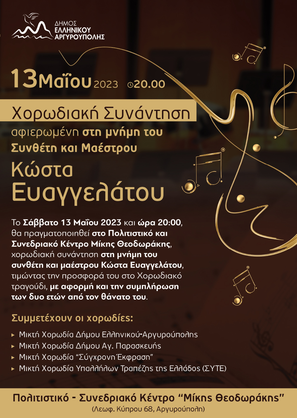 Χορωδιακή Συνάντηση αφιερωμένη στη μνήμη του Συνθέτη και Μαέστρου Κώστα Ευαγγελάτου θα πραγματοποιηθεί το Σάββατο 13 Μαΐου και ώρα 20:00 στο Συνεδριακό – Πολιτιστικό Κέντρο «Μίκης Θεοδωράκης», με αφορμή τη συμπλήρωση δύο ετών από τον θάνατό του, τιμώντας την προσφορά του στο Χορωδιακό Τραγούδι.