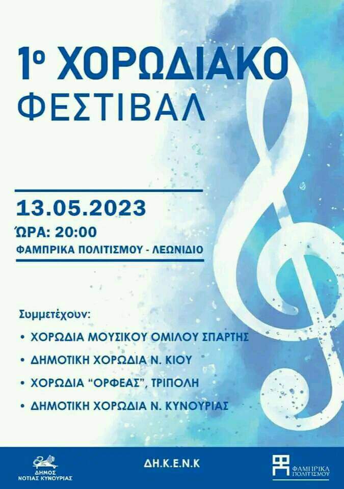 Ο Δήμος Νότιας Κυνουρίας και η ΔΗ.Κ.Ε.Ν.Κ διοργανώνουν το 1ο Χορωδιακό Φεστιβάλ.