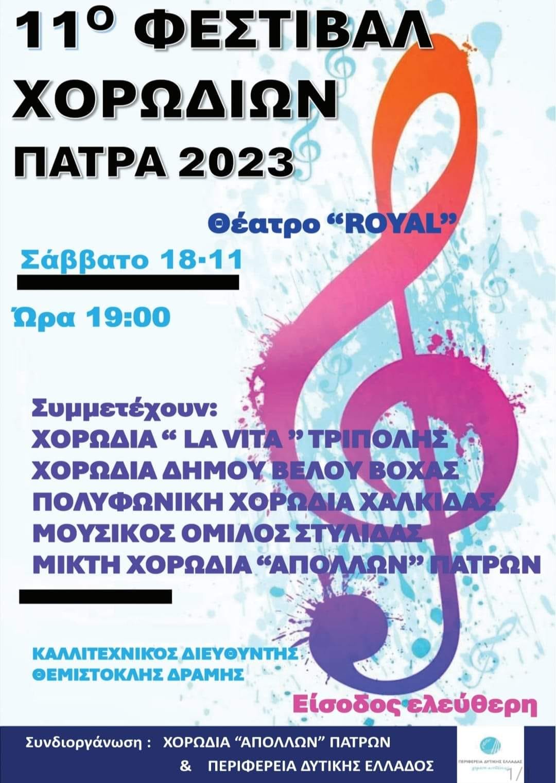 Το Σάββατο 18 Νοεμβρίου στο θέατρο Royal θα γίνει το 11ο χορωδιακό φεστιβάλ που οργανώνει η Χορωδία Απόλλων Πατρών. με συνδιοργανώτρια την Περιφέρεια Δυτικής Ελλάδος.