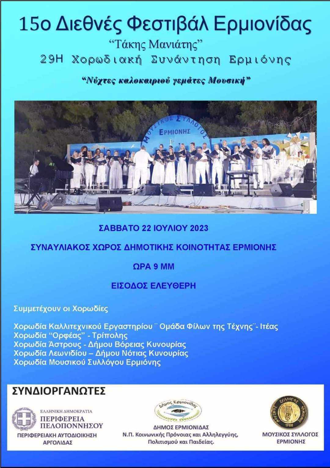 Το Διεθνές Φεστιβάλ Ερμιόνης πραγματοποιείται το δεύτερο 15θήμερο του Ιουλίου και διαρκεί έως τις αρχές Αυγούστου. Ξεκίνησε από το 1992 με τη μορφή χορωδιακών συναντήσεων και από το 2007 ως Διεθνές Φεστιβάλ.