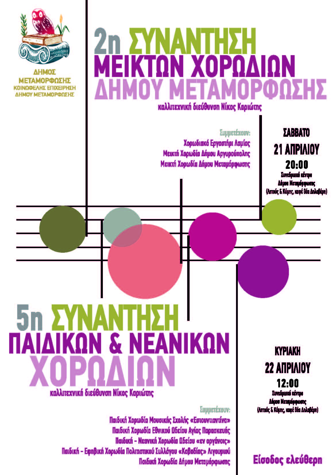 Ο Δήμος Μεταμόρφωσης και η Κοινοφελής Επιχείρηση του Δήμου διοργανώνουν τη 2η Συνάντηση Μικτών Χορωδιών και την 5η Συνάντηση Παιδικών και Νεανικών Χορωδιών που θα πραγματοποιηθούν υπό την καλλιτεχνική διεύθυνση του μαέστρου Νίκου Καρυώτη.