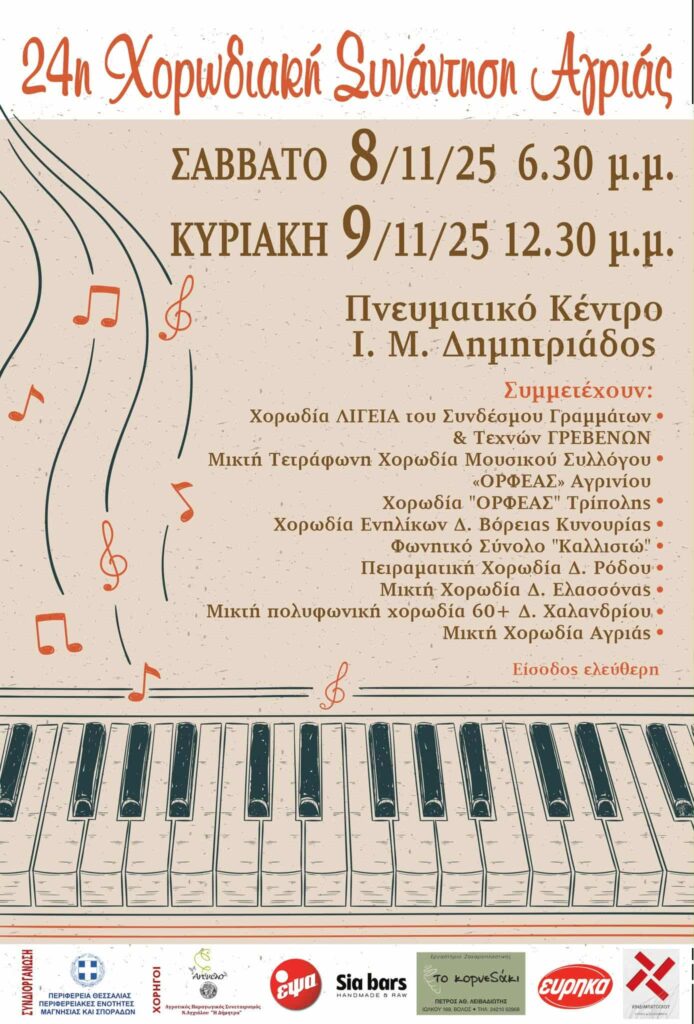 Η Μικτή Χορωδία Αγριάς, υπό τη μουσική διεύθυνση του κ. Νίκου Αδρασκέλα, διοργανώνει μαζί με την Περιφέρεια Θεσσαλίας την 24η Χορωδιακή Συνάντηση Αγριάς το Σάββατο 8/11/2025 και την Κυριακή 9/11/2025, με τη συμμετοχή χορωδιών από όλη την Ελλάδα. Στην φετινή εκδήλωση, τιμώμενο πρόσωπο θα είναι ο διευθυντής χορωδίας κ. Δημήτρης Καρβούνης. Πρόκειται για έναν θεσμό που σκοπό έχει να προαγάγει τη χορωδιακή μουσική και να προβάλει τον τόπο μας.