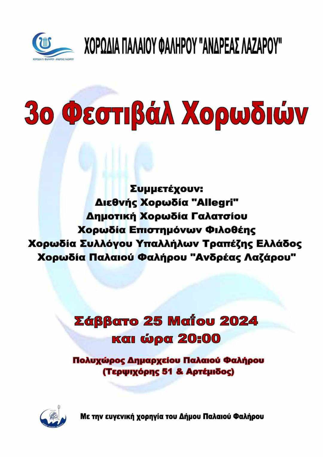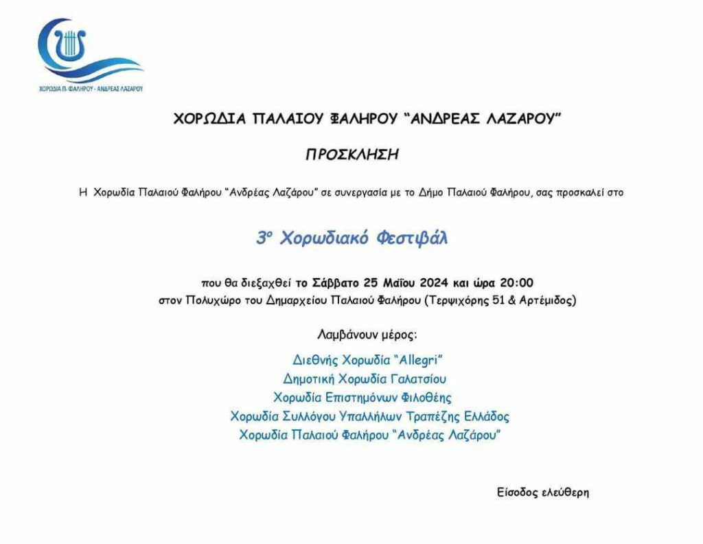 Η Χορωδία Παλαιού Φαλήρου “Ανδρέας Λαζάρου” σε συνεργασία με τον Δήμο Παλαιού Φαλήρου, σας προσκαλεί στο 3ο Χορωδιακό Φεστιβάλ, που θα πραγματοποιηθεί το Σάββατο 25 Μαΐου και ώρα 20:00, στον Πολυχώρο του Δημαρχείου Παλ. Φαλήρου (Τερψιχόρης 51 & Αρτέμιδος).