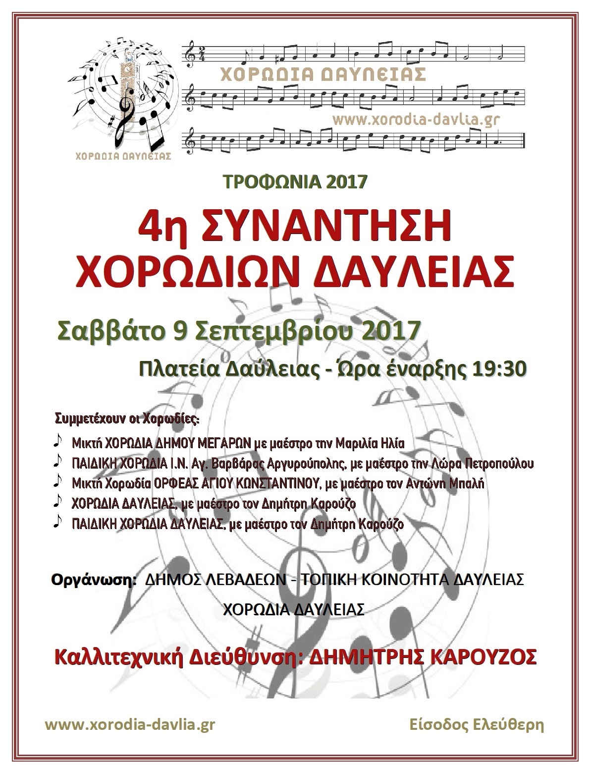 Η Χορωδιακή συνάντηση θα γίνει το Σάββατο 9 Σεπτεμβρίου 2017 στη Πλατεία της Δαύλειας στις 19:30.