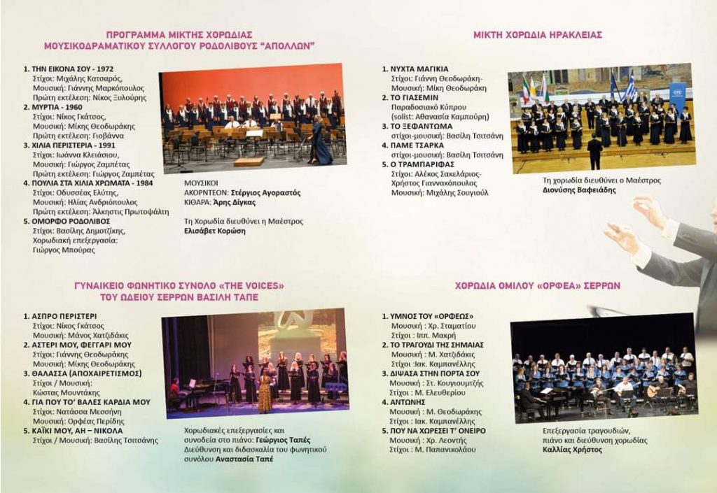 Θα συμμετέχουν οι χορωδίες του Ομίλου «Ορφέας» Σερρών, το Γυναικείο Φωνητικό σύνολο ‘’The voices’’ του Ωδείου Σερρών Βασίλη Ταπέ, η Μικτή Χορωδία Ηράκλειας και η Μικτή Χορωδία του Μουσικοδραματικού Συλλόγου ‘’ΑΠΟΛΛΩΝ’’ Ροδολίβους.