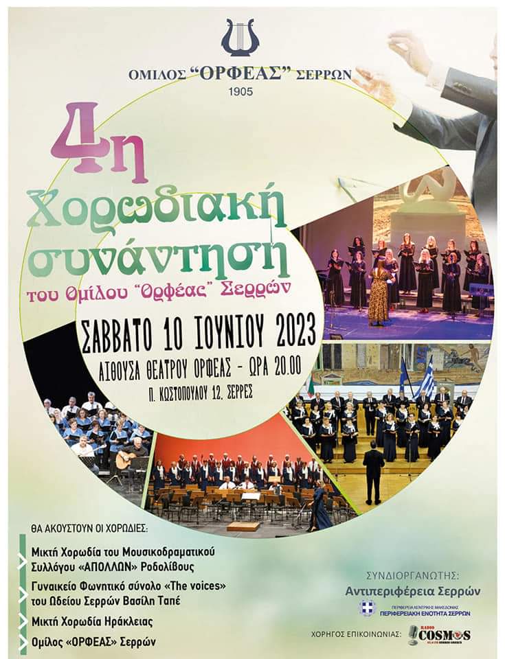 Ο Πρόεδρος και το Δ.Σ. του Ομίλου «Ορφέας» Σερρών σας προσκαλούν στην 4η Χορωδιακή Συνάντηση που θα πραγματοποιηθεί το Σάββατο 10 Ιουνίου 2023 και ώρα 20.00 στην αίθουσα «Ορφέας» επί της Π. Κωστοπούλου 12.