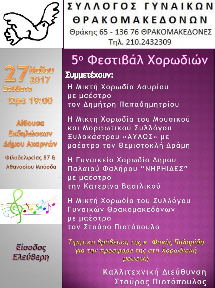 Η Μικτή Χορωδία του Συλλόγου Γυναικών Θρακομακεδόνων, διοργανώνει το 5ο Φεστιβάλ Χορωδιών στις 27 Μαίου 2017 ημέρα Σάββατο και ώρα 19.00 μ.μ στην αίθουσα εκδηλώσεων του Δήμου Αχαρνών Φιλαδελφείας 87 & Αθανασίου Μπόσδα στις Αχαρνές.