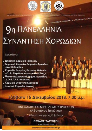 Πρόκειται για την 9η Πανελλήνια Συνάντηση Χορωδιών, που θα πραγματοποιηθεί το Σάββατο 15 Δεκεμβρίου 2018 στις 7:30μ.μ. στο Πνευματικό Κέντρο τού Δήμου Τρικκαίων «Αθανάσιος Τριγώνης», στην αίθουσα «Δημήτρης Καβράκος».