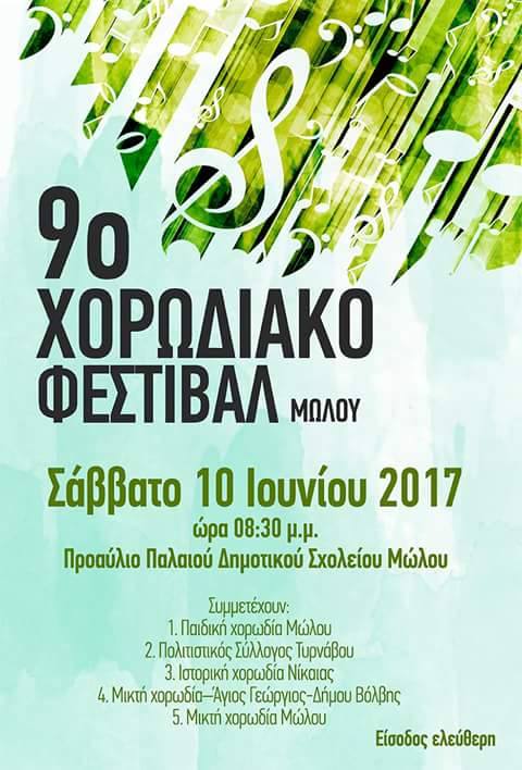 Το 9ο Χορωδιακό Φεστιβάλ Μώλου θα πραγματοποιηθεί Σάββατο 10 Ιουνίου 2017 στις 20:30 μ.μ.με την συμμετοχή πολλών χορωδιών.